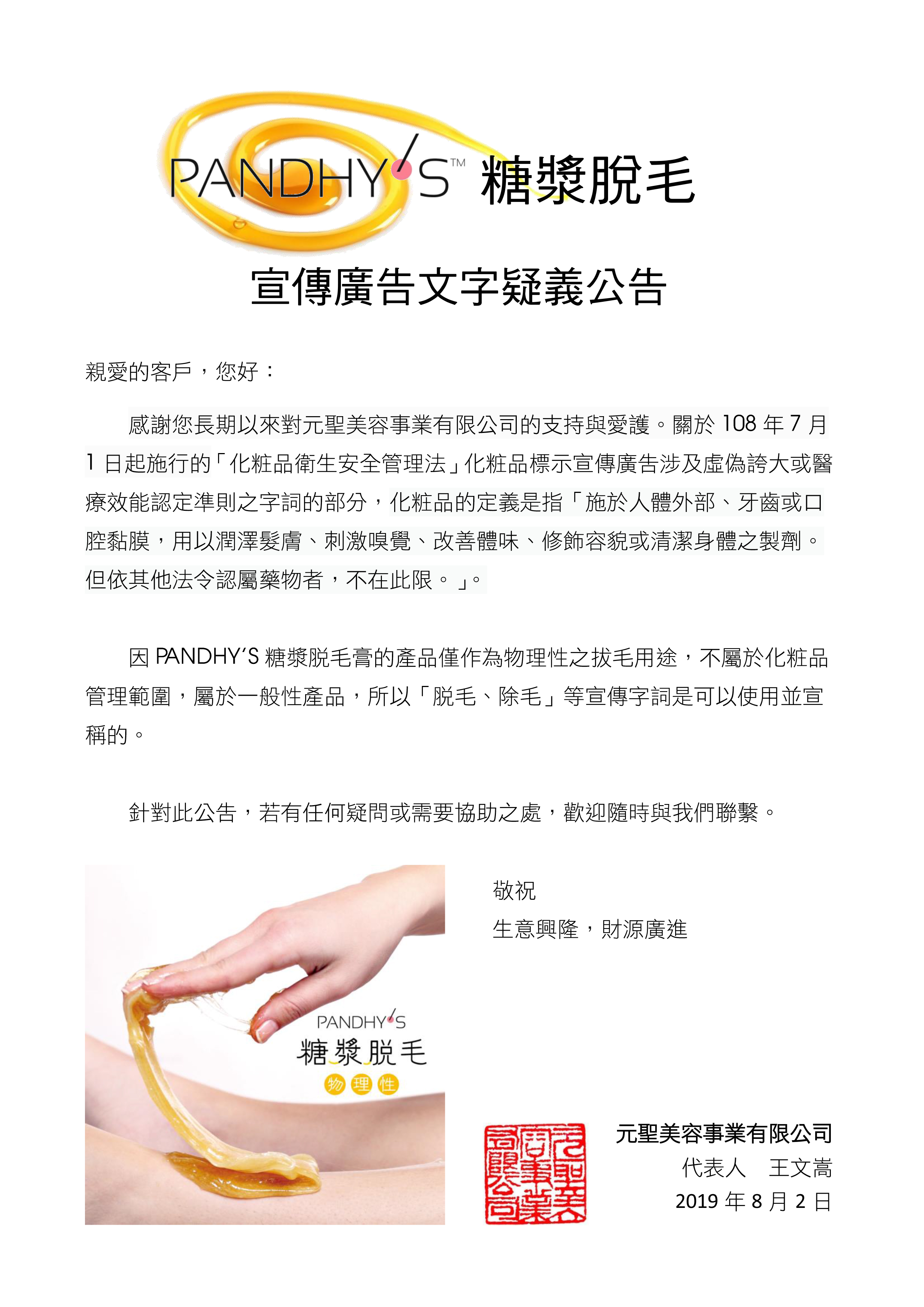 PANDHY'S糖漿脫毛廣告文字疑義公告
